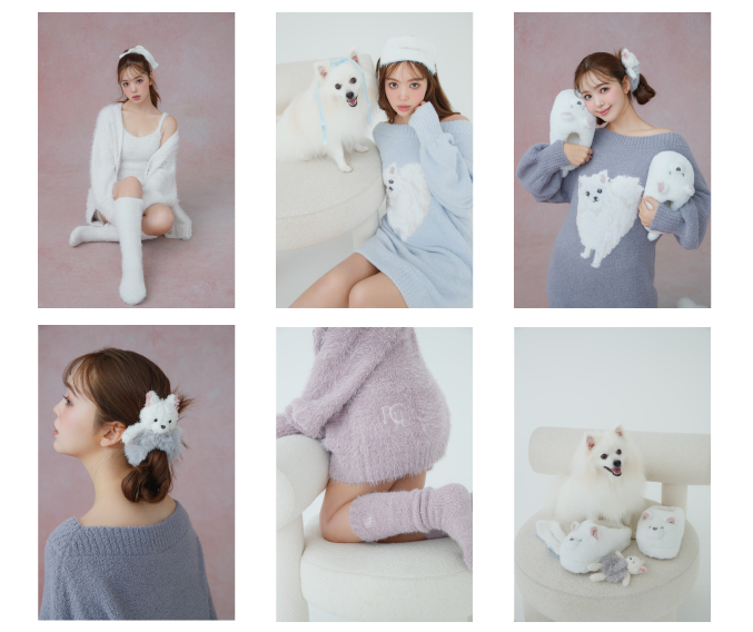 コラボレーションアイテムは、パジャマ3点セット(ふわふわなフェザーヤーンニットを使用したカーディガン、キャミソール、ショートパンツ)や、白いわんちゃんの柄がキュートなニットワンピース、おうち時間を充実させるグッズなどなど全6型。商品名にもこだわっており、白いわんちゃんをモチーフにしたアイテムには、「わん」という犬の鳴き声をアイテム名に入れるなど、ユーモア溢れるものになっています。